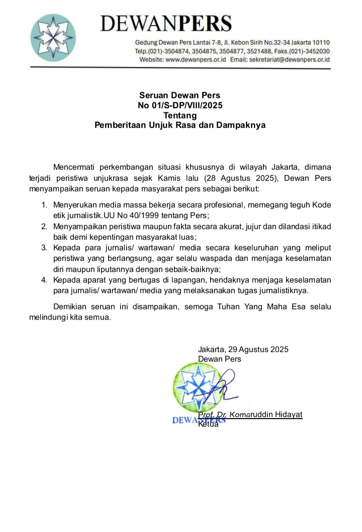 Dalam surat bernomor 01/S-DP/VIII/2025 bertanggal 29 Agustus 2025, Dewan Pers mengingatkan agar media massa berpegang teguh pada UU Nomor 40 Tahun 1999 tentang Pers dan Kode Etik Jurnalistik dalam menjalankan tugasnya.