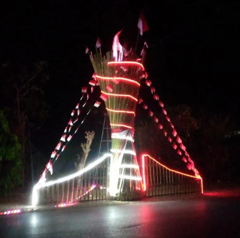 Salah satu magnet perhatian adalah gapura berornamen budaya lokal Tambur atau Tihar, dilengkapi delapan bendera merah putih mini, lidah api, dan lampu LED merah-putih yang menyala di malam hari.