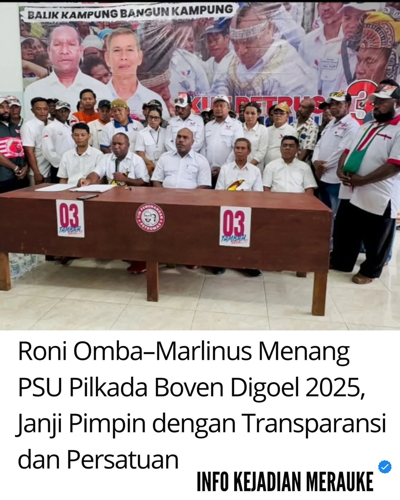 PAPUA SELATAN |BELUPOS.Com)— Pasangan calon Bupati dan Wakil Bupati nomor urut 3, Roni Omba dan Marlinus, resmi keluar sebagai pemenang dalam Pemilihan Suara Ulang (PSU) Pilkada Boven Digoel 2025. Kemenangan ini ditetapkan melalui rapat pleno terbuka Komisi Pemilihan Umum (KPU) Kabupaten Boven Digoel yang digelar pada Rabu (13/8/2025).